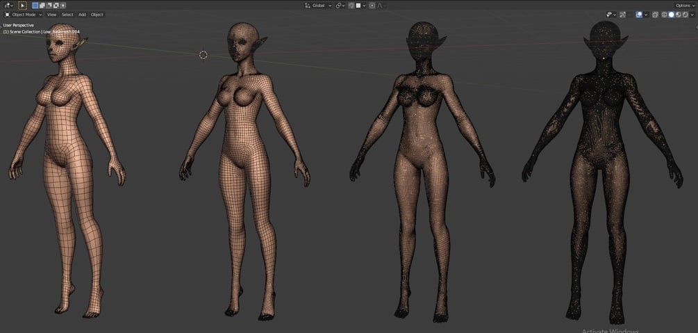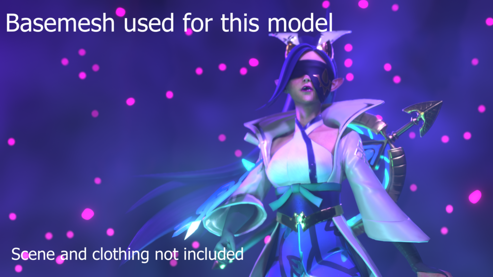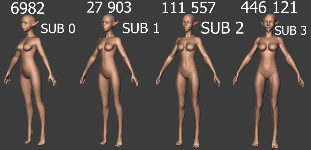 Female base mesh with long elf like ears. There is blender file with all 4 basemesh subdivisions and same for zbrush file. Also there are OBJ file and it contains all the things you might want: nails, hair !